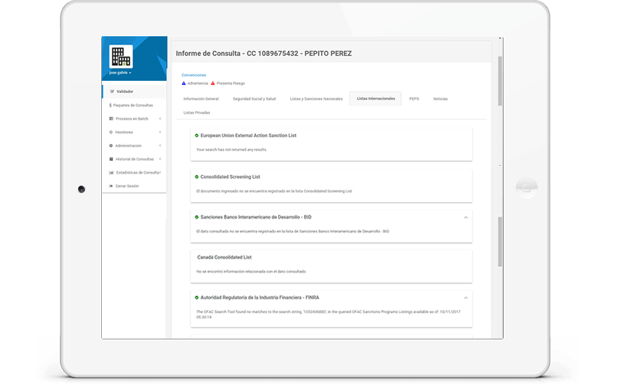 Prevenga los riesgos del Lavado de Activos y la Financiación del Terrorismo (LAFT). valide en tiempo record proveedores y clientes. Conozca si cuentan con vínculos reales con el terrorismo, contrabando, actividades ilícitas. Realice una adecuada selección, consultando listas restrictivas, listas vinculantes, listas sancionatorias, Listas PEPS; Cumpla con el SARLAFT, SIPLAFT y las exigencias de entidades que lo requieran.